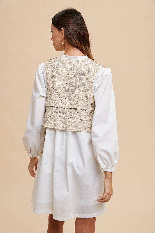 Annie Wear Crochet Vest Notched Long Sleeve Shirt Dress
