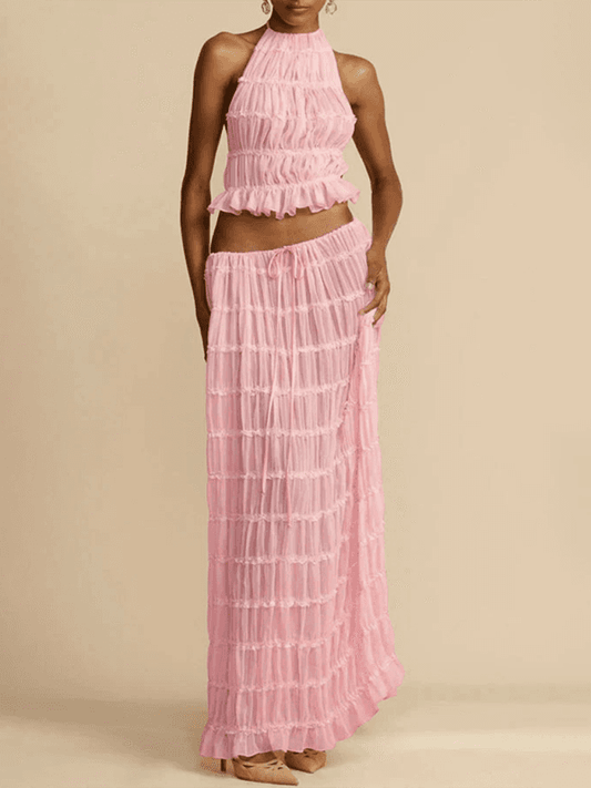 Backless lace-up halter top set and two-piece chiffon pleated long skirt with earrings