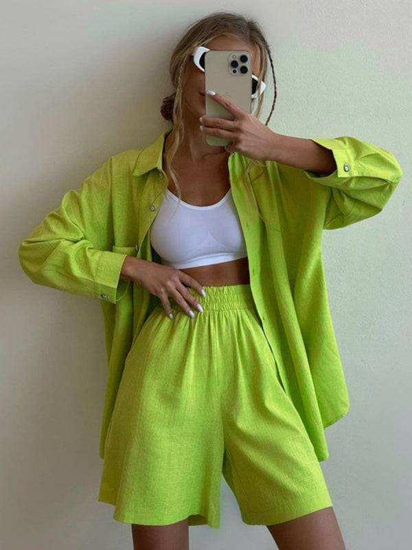 New Arrival Solid Color Single Breasted Long Sleeve Lapel Shirt Shorts Loose Suit